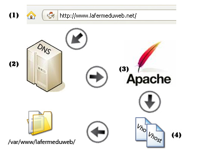 (1) L'utilisateur va entrer l'adresse de notre site dans son navigateur. (2) Les serveurs DNS vont être interrogés pour connaître l'IP associée (3) Notre serveur web est interrogé (4) Les fichiers vHosts sont analysés par Apache, s'il trouve une correspondance avec l'adresse demandée, il appelle le fichier index du répertoire associé. Et la page est affichée au visiteur.